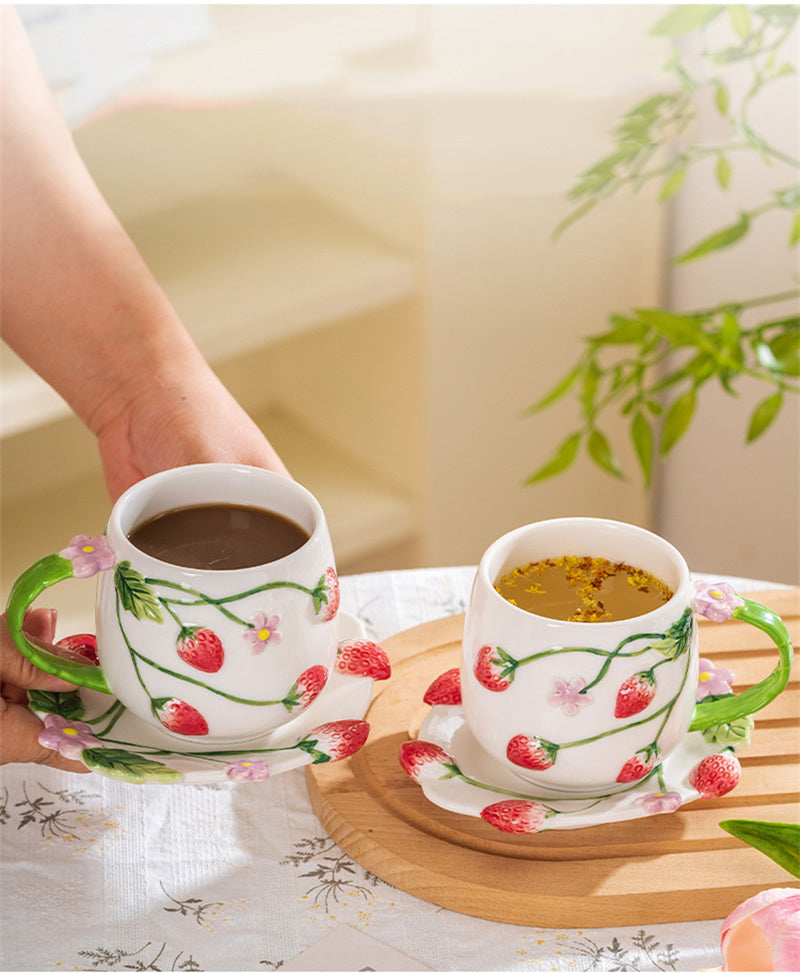 3D Hand-Painted Strawberry Ceramic Cup,Artisanal Tea/Coffee Tableware with Dessert Plate