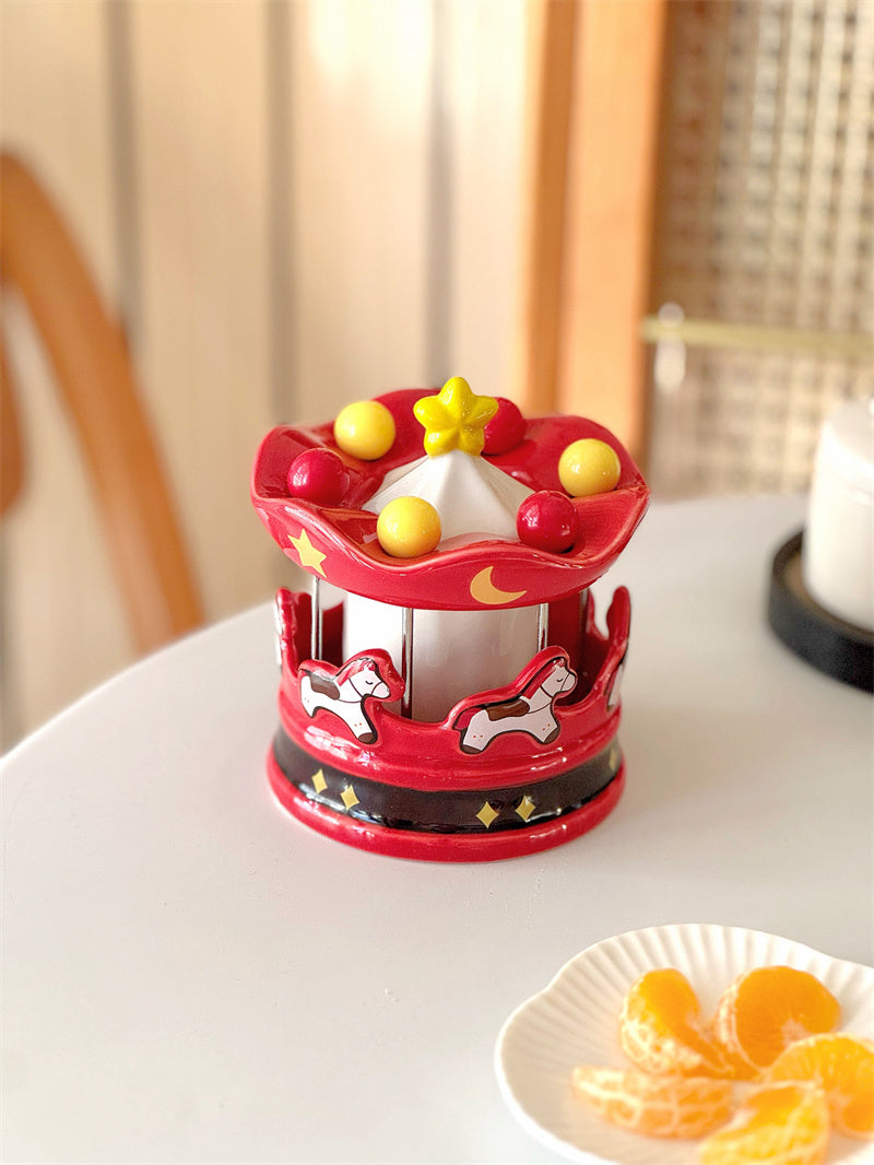Features a vivid carousel silhouette with red, yellow, and black accents, decorated with hand-painted horses, star patterns, and 3D "ball" details. The removable white-and-gold "carousel roof" lid adds a whimsical touch, turning a functional holder into a charming decorative piece that fits festive, cute, or family-style dining spaces.