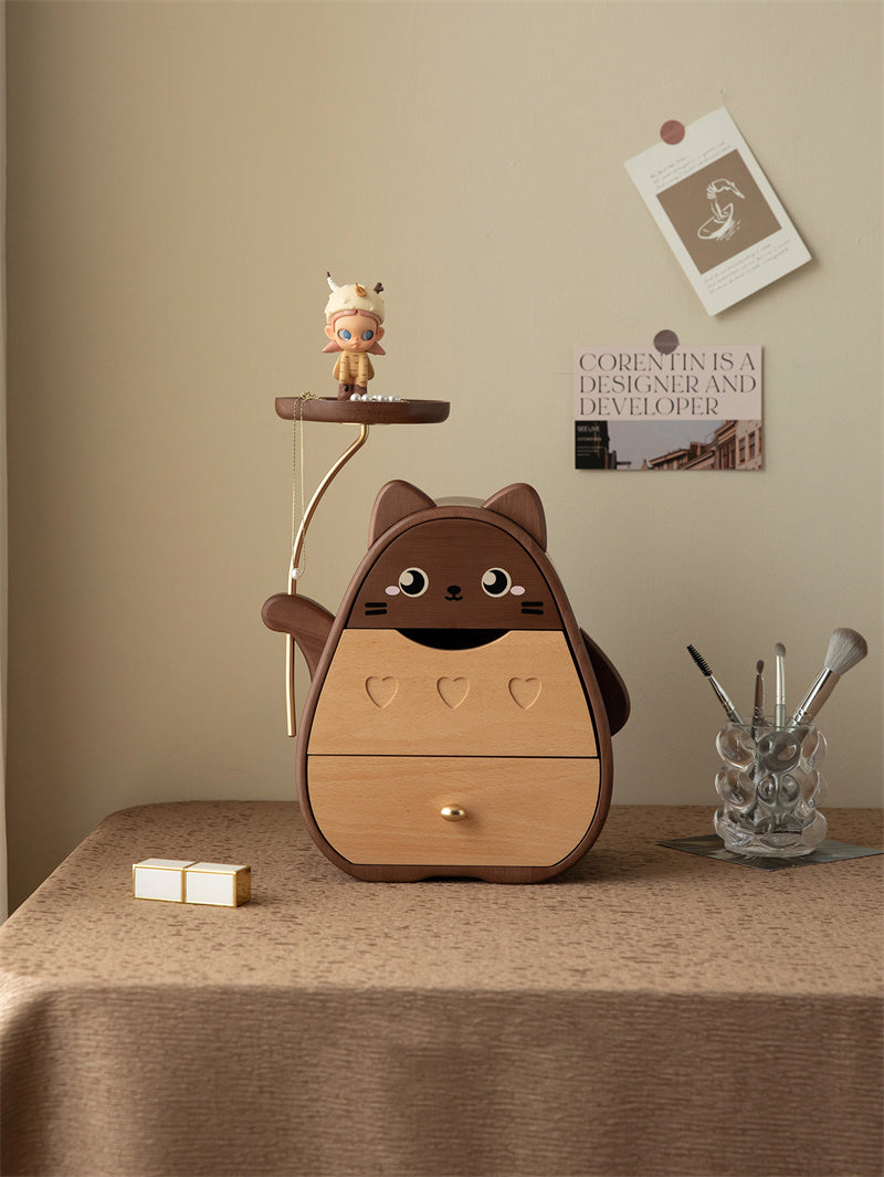 Whimsical Cat Jewelry Box - Wooden Organizer with Dual Drawers & Top Slot