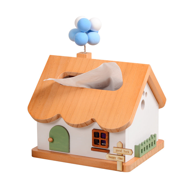 Designed with enchanting fairy-tale details: a tiny green door, miniature wooden window, small picket fence, and top-mounted blue-white balloon accents (plus "good luck" & "happy time" sign plaques), this tissue box infuses any space with storybook warmth.